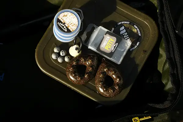 Druhé a třetí závaží tvoří před náhozem víceméně jeden bod, ovšem jakmile se montáž ocitne ve vzduch, krásně se od sebe oddělí a ukotví vlasec na dalších 2 místech vzdálených od sebe cca. 1-3m. Mluvím o malém 5-10g kulatém olůvku, které zajišťuji zhruba 100 až 150cm od hlavního olova nikoliv pomocí plavačkové zarážky, ale drobným bročkem Camo Shotz od Carp´R´Us. Ty jsou k dispozici ve 2 zbarveních a 4 vahách – 0,40, 0,90, 1,20 a 1,60g.
