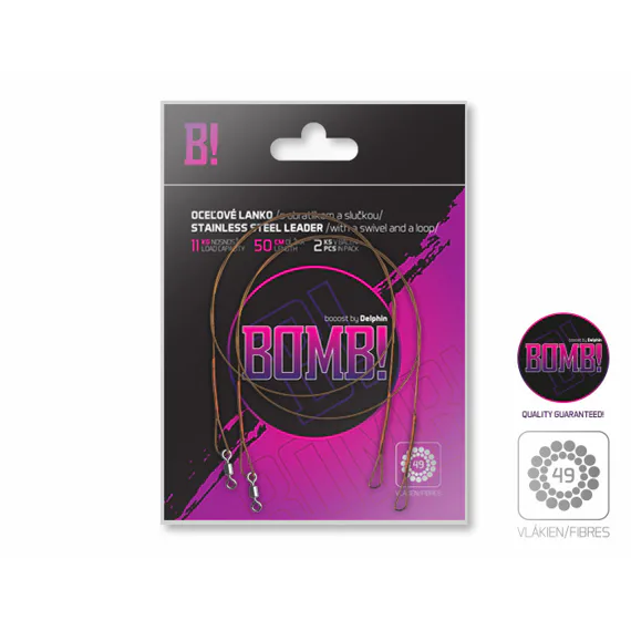 Delphin BOMB! ocelové lanko s obratlíkem a smyčkou o délce 50 cm a nosnosti 11 kg je přívlačový návazec vyrobený pletením 49 vláken z nerezavějící oceli (7×7), který kombinuje výjimečnou jemnost s nekompromisní odolností vůči ostrým zubům dravců i podvodním překážkám. Díky své konstrukci nabízí velmi příjemnou a lehkou manipulaci a zároveň umožňuje prezentovat nástrahu na špičkové úrovni i těm nejopatrnějším predátorům, aniž by byl narušen její přirozený pohyb. Na jedné straně lanka se nachází obratlík a na druhé pevná smyčka, přičemž balení obsahuje 2 kusy tohoto spolehlivého ocelového návazce.