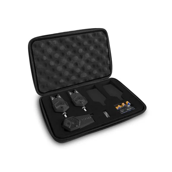 Sada obsahuje: 2× signalizátor záběru (červený a modrý), 1× přijímač, transportní kufřík, 2× snag gears, poutko pro zavěšení příposlechu, sadu baterií k otestování funkcí
