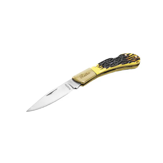 Rukojeť z kovu a imitace parohu evokuje tradiční vzhled starých loveckých nožů, zatímco tlačná pojistka zajišťuje bezpečné používání. Retro je skvělou volbou pro ty, kdo ocení jednoduchost, funkčnost a klasický design v jednom.