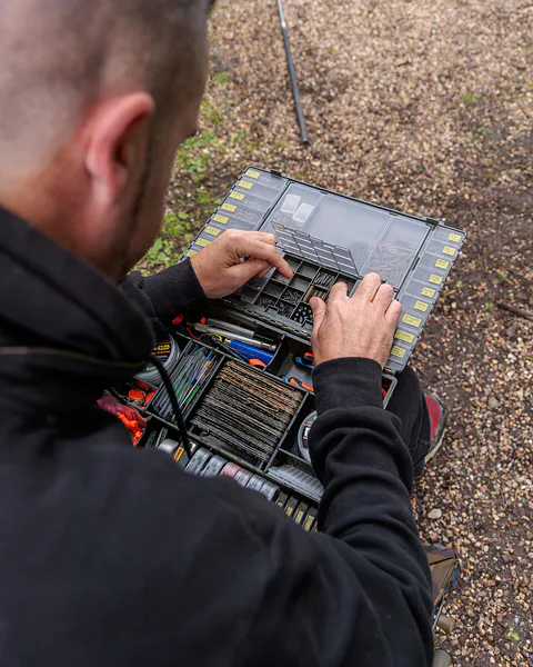 Konstrukce víka umožňuje otevření do úhlu 180 stupňů, což výrazně usnadňuje manipulaci a vázání návazců přímo na klíně. Vnější i vnitřní část je vybavena praktickým pravítkem, které nabízí přesné měření při přípravě montáží. Součástí balení jsou samolepicí štítky, díky nimž lze všechny přihrádky dokonale označit a udržet jasný přehled.