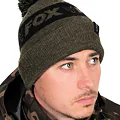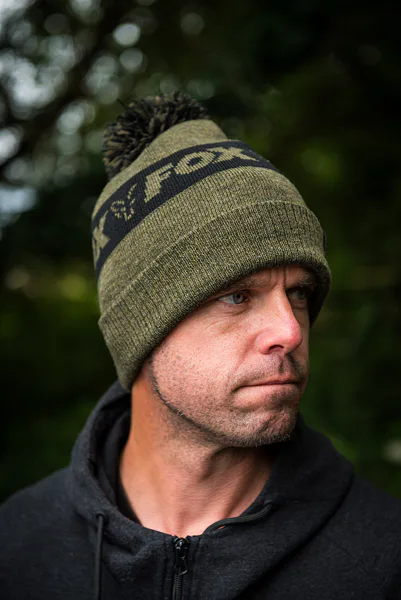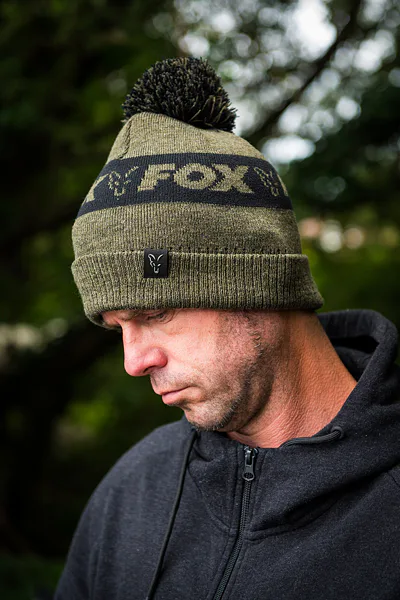 Zeleně melírovaný kulich s bambulí a černým logem Fox.