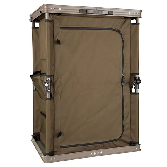 Regál je vyroben z odolného 210D materiálu v tmavě zeleném provedení, který zajišťuje dlouhou životnost a ochranu uložených věcí. Nastavitelné nohy umožňují stabilní postavení i na nerovném terénu, což se hodí v přístřešcích u vody. Postavení regálu zabere jen pár okamžiků a díky promyšlenému členění vznikne jasný prostor pro uložení veškerých potřeb, které by jinak zabíraly místo na zemi.