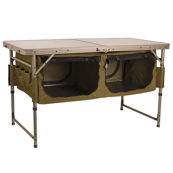 Khaki rám z pevného hliníku poskytuje vysokou stabilitu, zatímco odolná polyesterová tkanina tvoří praktické úložné sekce chráněné síťovanými otvory na zip. Celý systém umožňuje pohodlně uložit nádobí, příslušenství či jiné nezbytnosti, aniž by zabíraly místo na pracovní ploše. Díky samostatným sekcím je možné rozdělit vybavení podle potřeby a udržet pořádek i na delších pobytech u vody.