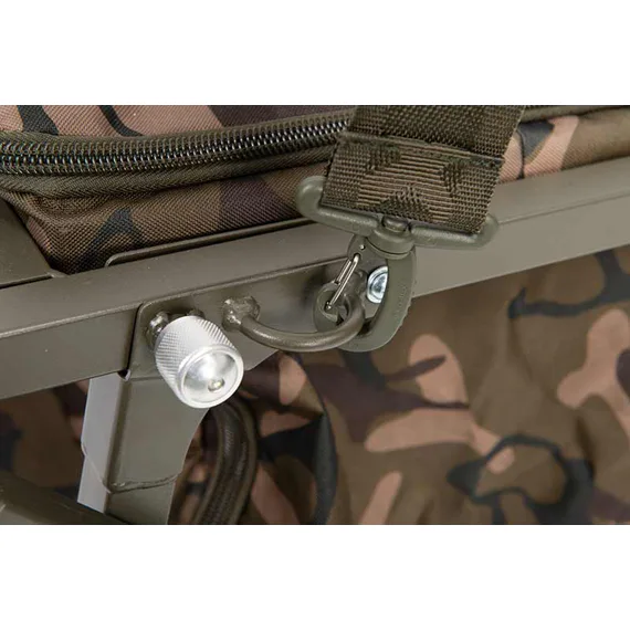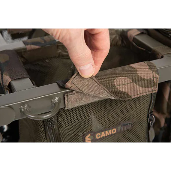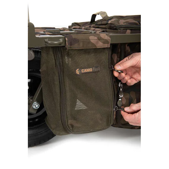 Centrální camo brašna s rychlým přístupem a dvě boční síťované kapsy poskytují dostatek úložného prostoru pro nástrahy, láhve i nezbytné doplňky. Rychloupínací systém kola s nafukovací pneumatikou usnadňuje manipulaci a zajišťuje hladký pohyb i v bahně nebo na nerovném povrchu. Otočné bahenní patky s malými hroty dále zvyšují stabilitu vozíku, takže stojí pevně i při větším zatížení během přípravy lovného místa.