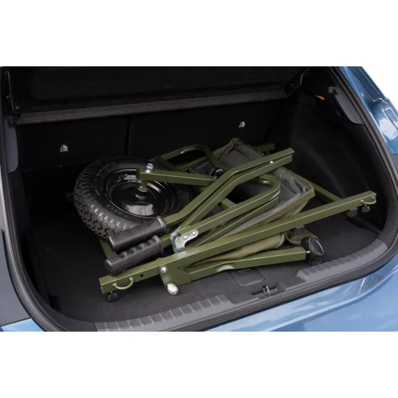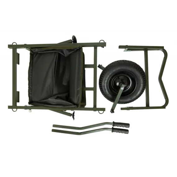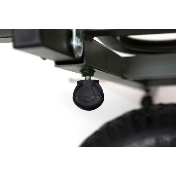 Odolný rám vozíku doplňují ergonomicky tvarované rukojeti, které umožňují pohodlný úchop i při plném naložení. Otočné patky do bahna se špičkami poskytují potřebnou oporu v měkkém podloží, takže vozík zůstává stabilní i při manipulaci ve svahu nebo na rozmočeném břehu. Kola s pneumatikou a ložisky se snadno otáčejí a zajišťují plynulou jízdu, což výrazně snižuje námahu při přepravě těžší výbavy.