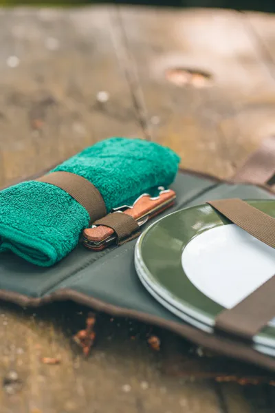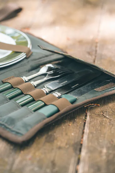 Součástí sady je polstrovaný obal, dva plastové talíře, dvě vidličky, dva nože, jeden nůž na maso nebo ovoce, multifunkční nožík s vývrtkou na otevírání láhví a konzerv a jeden malý ručník, takže máte k dispozici vše potřebné pro plnohodnotné stolování. Vše je prakticky uspořádané a chráněné, aby vybavení zůstalo čisté a připravené k použití.
