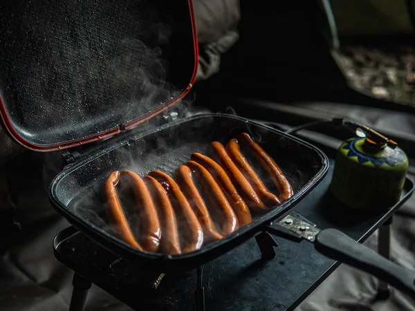 Součástí pánve je ergonomická rukojeť s magnetickým klipem, která zajišťuje bezpečné přenášení i snadné otáčení pánve bez rizika otevření. Silikonové těsnění pomáhá udržet teplo uvnitř a nepřilnavý povrch usnadňuje manipulaci s potravinami i následné čištění, což oceníte zejména při delších pobytech u vody.