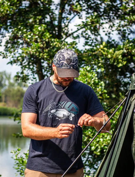 Tričko je zpracováno v moderním pánském střihu, který poskytuje maximální komfort při pohybu a dobře sedí na postavě po celý den. Hlavním vizuálním prvkem je originální motiv rybáře s kaprem na přední straně, jenž jasně odkazuje na rybářskou vášeň a dodává tričku osobitý charakter, aniž by působil rušivě při běžném nošení.