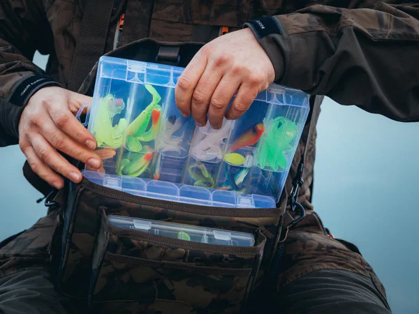 Součástí tašky jsou dvě větší krabičky umístěné v hlavní části a jedna menší krabička uložená v přední kapse, což umožňuje systematické rozdělení nástrah podle typu nebo velikosti. Toto řešení výrazně zrychluje práci při vláčení a zajišťuje, že jsou nástrahy bezpečně uložené, chráněné a snadno dostupné během každé vycházky.