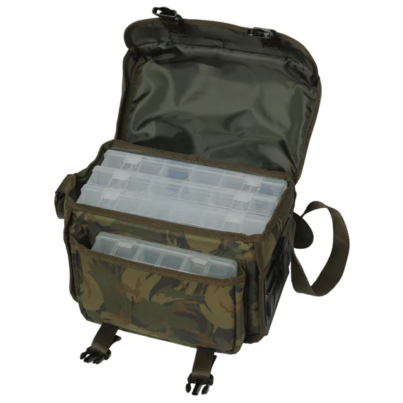 Vláčecí taška střední velikosti, která obsahuje tři větší a dvě menší krabičky na nástrahy.