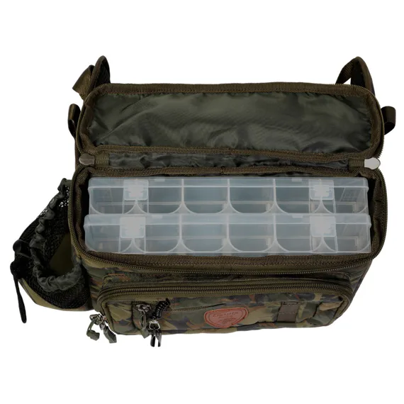 Vláčecí ledvinka s integrovaným cvakátkem na vlasec, která obsahuje dvě plastové krabičky na nástrahy.