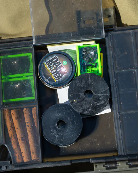 Součástí vnitřního prostoru jsou také dvě velké přihrádky s pevnými přepážkami, které pojmou potřebné pomůcky pro tvorbu návazců, například jehly, vrtáčky, cívky s návazcovými materiály nebo kroužky. Toto oddělení pomáhá udržet pořádek a umožňuje mít nejčastěji používané nástroje okamžitě po ruce.