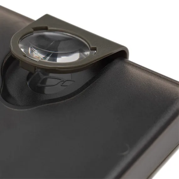 - víko je opatřeno vestavěnou výklopnou lupu, kterou lze použít třeba ke kontrole ostří háčku