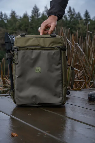 Batoh je doplněný o dvě boční poutka pro uchycení vidliček nebo rukojeti podběráku a také o samostatnou polstrovanou horní kapsu na zip, která je vhodná například pro uložení Tackle Blox. Kvalitní dvoucestné zipy podporují pohodlné používání a přední i spodní strana z omyvatelného materiálu usnadňuje údržbu, takže batoh zůstává praktický i při častém používání v terénu.