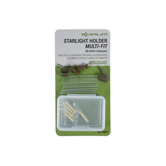 Praktická sada držáků na chemické světlo včetně chemických světýlek Korum StarLight Holder Kit umožňuje jejich snadné a bezpečné upevnění na špičku feederového prutu.
