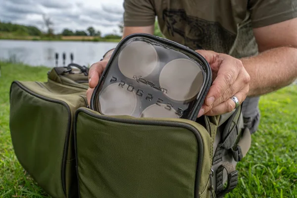 Korum Progress EVA Hookbait Pouch 4 Tub je odolné omyvatelné EVA pouzdro s průhledným víkem a 4 dózami s víčky na nástrahy či dipy, navržené do tašek a batohů Korum Progress; 14×14×10 cm.