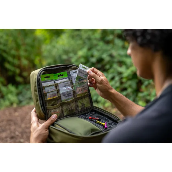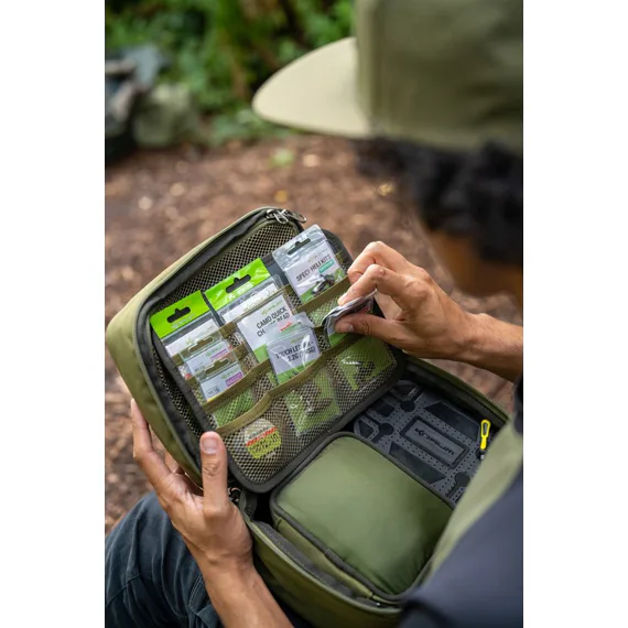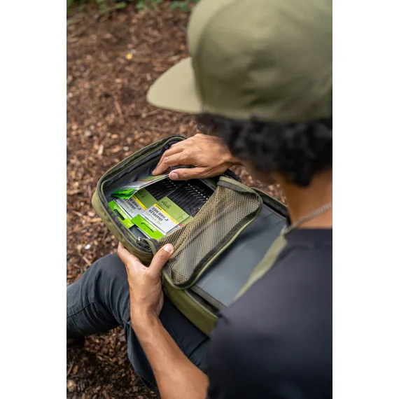 Díky vnitřní přepážce s kapsami lze bezpečně a přehledně uložit háčky, návazcové doplňky i další příslušenství.