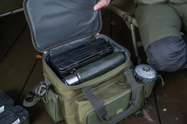 Horní část je polstrovaná pro maximální ochranu obsahu, takže citlivější věci zůstávají lépe chráněné při přepravě i při manipulaci v terénu. Spodní část hlavního prostoru je opatřena thermo materiálem pro udržení čerstvosti obsahu, což podporuje praktičnost při uchování nástrah i potravin v lepší kondici během delšího pobytu u vody. Díky tomuto rozdělení získáte tašku, která je zároveň ochranná i izolační přesně tam, kde je to potřeba.