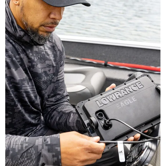 Upozornění:Eagle Eye 9 má na zadní straně jiný sonarový konektor s jinou konfigurací pinů než ostatní displeje řady Lowrance Eagle. Eagle Eye 9 je samostatný kompletní produkt a jeho live sonda není kompatibilní s jinými displeji řady Lowrance Eagle. Není tedy možné dokoupit pouze sondu k echolotům řady EAGLE.