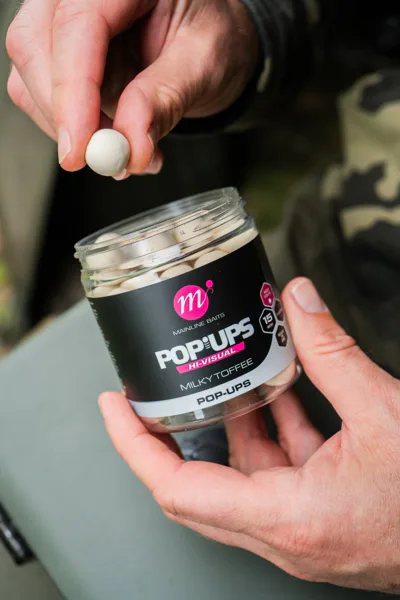 Mainline Hi-Visual Pop-ups Milky Toffee jsou plovoucí boilies s mimořádně vysokým obsahem esence, která zajišťuje extrémní atraktivitu i v podmínkách, kdy ryby reagují jen minimálně. Řada je navržena speciálně pro lov zkušených, opatrných a velkých kaprů, takže dokáže spolehlivě fungovat i během zimních měsíců nebo ve velmi studené vodě a přináší jistotu i při slabé aktivitě ryb.