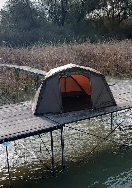 Přední část je zpevněna a stabilizována dvoudílnou sklolaminátovou výztuhou s unikátně navrženým způsobem fixace a konstrukce nad vchodem vytváří kšilt, který chrání prostor dveří před deštěm. Přední okno je řešeno jako třívrstvé (síťka / transparentní PVC / nylonový plášť) a nechybí ani plně odepínací přední stěna, takže si brolly snadno přizpůsobíte podmínkám i roční době.