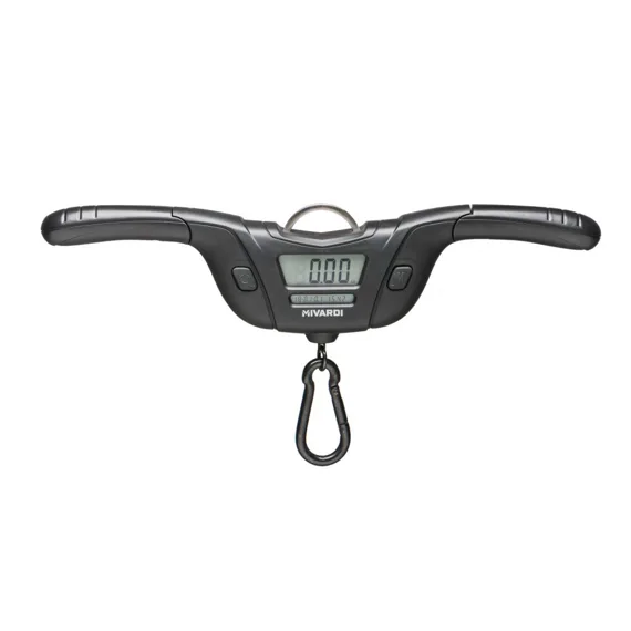 Luxusní digitální váha s masivními sklápěcími rukojeťmi, pevnostním závěsným okem a kvalitní karabinou pro zavěšení vážícího saku.