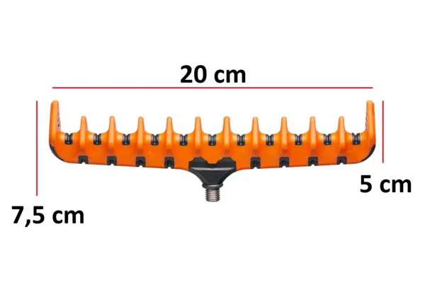 Mivardi Feeder podpěra prutu SensiTouch Multi je široká přední podpěra prutu pro lov na method / feeder s kvalitním zpracováním, velmi pevnou a stabilní konstrukcí a výraznými výstupky, které bezpečně drží prut ve zvolené pozici i ve větru, silném proudu či při prudkém záběru. Drobné výřezy v každé pozici usnadňují průchod vlasce mezi podpěrou a blankem prutu, měkčený SoftTouch povrch chrání prut před poškrábáním a kvalitní mosazný závit je kompatibilní se všemi standardními vidličkami, držáky a rameny. Technické parametry: rozměry (Š × V) 20×7 cm, hmotnost 81 g.