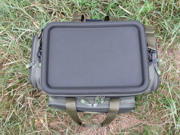 Velkou výhodou je pevné víko se speciálním tvarováním, které slouží jako stoleček na příslušenství a umožní mít drobnosti přehledně po ruce při vázání i přípravě montáží. Nohy stolečku jsou integrované v rozích tašky, takže rozložení je rychlé a stabilní, zatímco bohatě polstrovaný popruh zajišťuje pohodlné přenášení i při plném naložení.