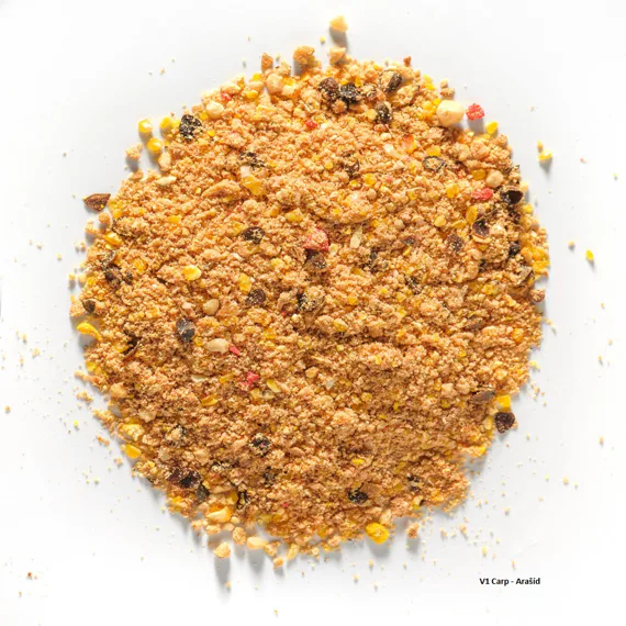 V1 Carp – Arašíd: střední zrnitost, světle bronzová barva a příjemné aroma ořechů. Krmení je postaveno převážně na přírodních komponentech a aromatech, proto funguje velmi stabilně bez ohledu na roční období nebo teplotu vody.