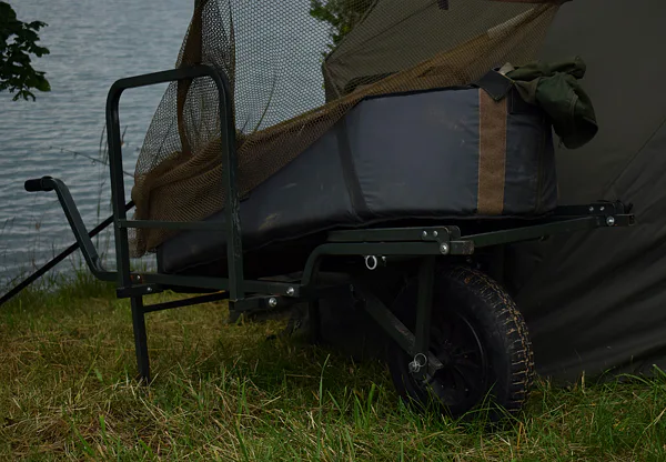 Velký a prakticky řešený přepravní vozík na rybářské náčiní, který disponuje kompaktními rozměry a po složení umožňuje snadnou přepravu v autě.