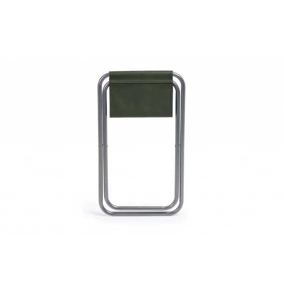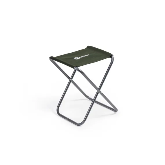 Klasická rybářská stolička s jednoduchou konstrukcí a pevným potahem.