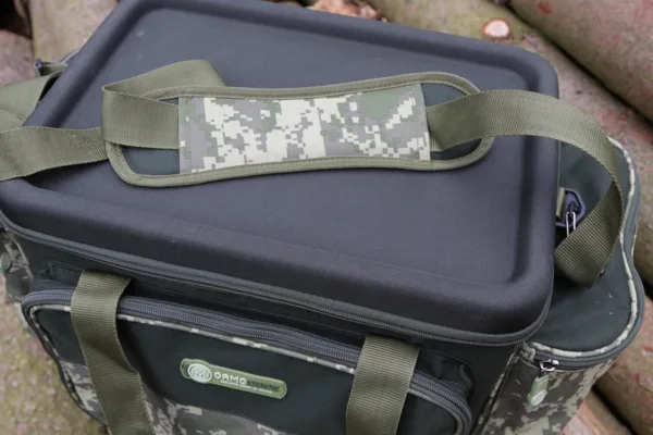 Precizně zpracovaná přepravní taška v atraktivním designu digitálního maskáče s prostornými bočními kapsami, tvrzeným víkem sloužícím jako stolek na drobné příslušenství.