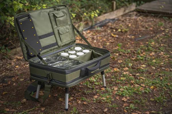 NGT Stolek s kufrem Carp Bivvy Table System je kvalitně zpracovaný kufřík s integrovaným stolkem, který lze snadno vyjmout a používat jako klasický stolek do bivaku i samostatný kufr na vše nezbytné; díky robustnímu provedení, kvalitním dvoucestným zipům, odolným materiálům, vydatnému polstrování uvnitř i na poutku a ramenním popruhu a možnosti individuálně upravit vnitřek budete mít vybavení přehledně na jednom místě, stolek má čtyři nastavitelné nohy a víko lze nastavit popruhy na suchý zip, součástí je 6 uzavíratelných plastových nádob na dipy či nástrahy, 2 polstrovaná pouzdra s nastavitelnými odnímatelnými přihrádkami a průhledným víkem, 2 menší krabičky se 6 přihrádkami, 1 větší krabička s 9 přihrádkami přichycené suchým zipem, odnímatelná EVA deska na návazce také na suchý zip a dvě řady gumových popruhů na jehly, nůžky a drobnosti, nechybí polstrovaná přední kapsa na zip a dvě menší síťované kapsy; technické parametry: vnější rozměry 53 × 33 × 18 cm, vnitřní 51 × 31 × 11 cm, pouzdra 23 × 14 × 8 cm, přední kapsa 27 × 25 × 4 cm, menší krabičky 9 × 6,5 × 2 cm, větší krabička 14 × 10 × 4,5 cm, stolek 50 × 30 × 17–25 cm, max. délka návazce 24 cm, kufr lze zvednout od země 17–25 cm.