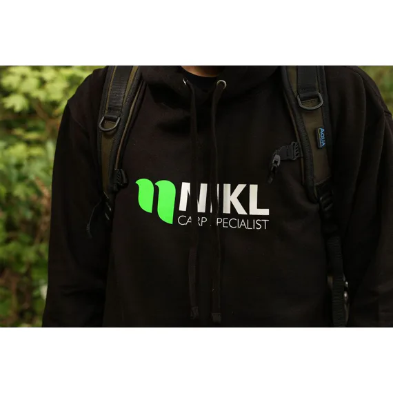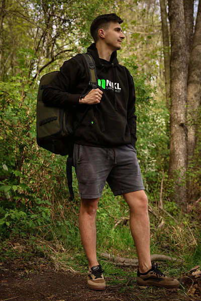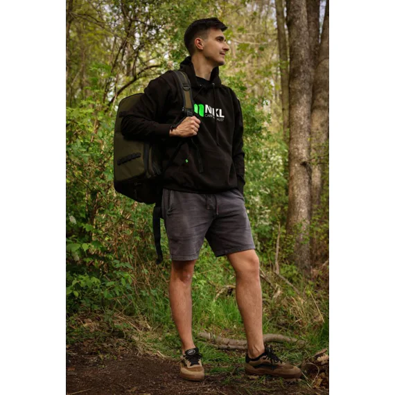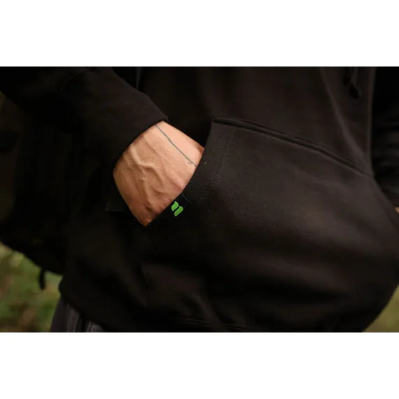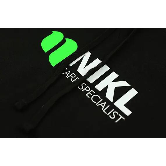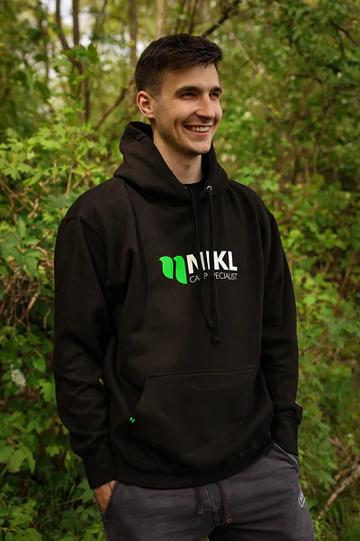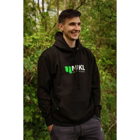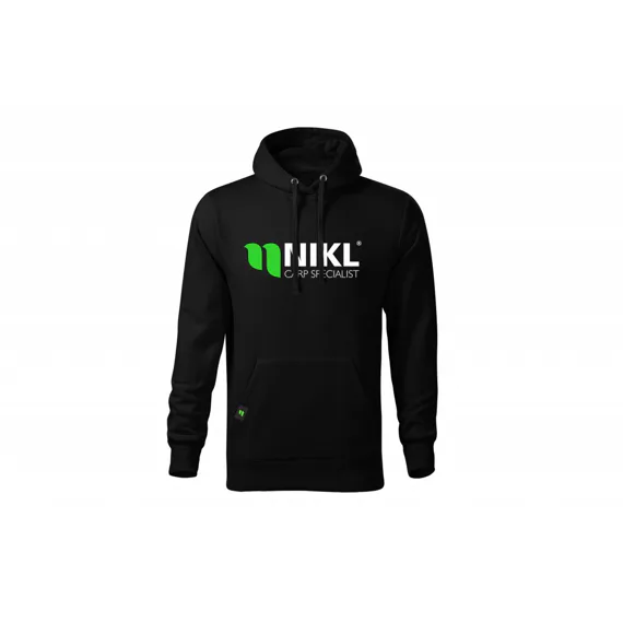 Stylová mikina v černé barvě s kapucí, velkou přední kapsou a logem Nikl na hrudi.