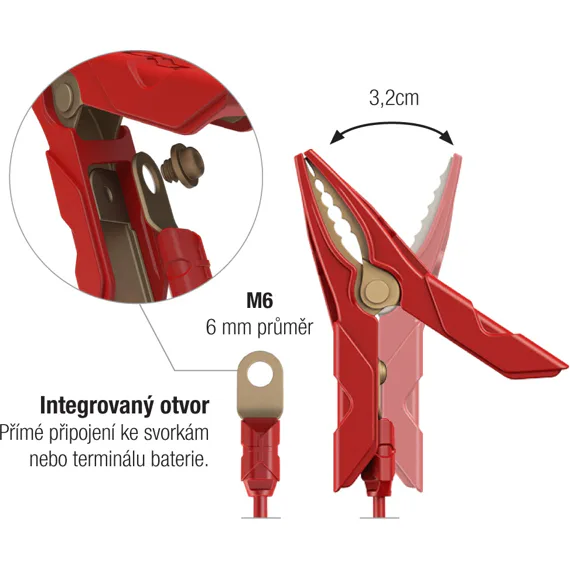 - svorky mají široký rozsah upnutí a zvýšenou upínací sílu pro lepší přenos napětí do baterie