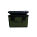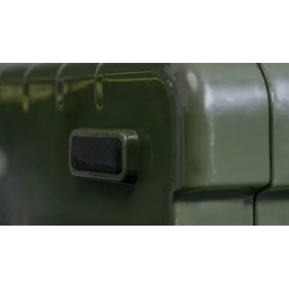 Víko je vzduchotěsné a zajišťuje se velkými kovovými zacvakávacími klipy. V rozích víka a základny jsou otvory na provlečení visacích zámků, takže je možné box v případě potřeby uzamknout.