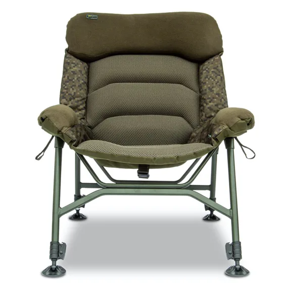 Rám je vyroben ze stejného hliníku s vysokou pevností v tahu jako nejlepší lehátka a křesla od společnosti Solar. Přední i zadní skládací nohy jsou opatřeny zajišťovacími sponami, takže se křeslo při bočním pohybu nikdy nezhroutí a nastavení nohou pomocí systému Spring-Loc umožňuje velice snadné nastavení otočných patek proti zaboření do bláta.