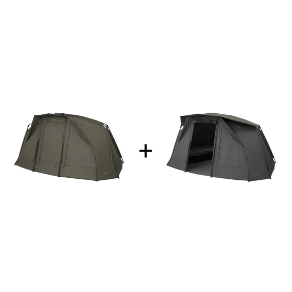 Set rychle sestavitelného přístřešku Trakker Tempest RS 200 s Kšiltem Tempest RS 200 Skull Cap , který kryje prostor dveří a zamezuje průniku deště a vytváří stín.