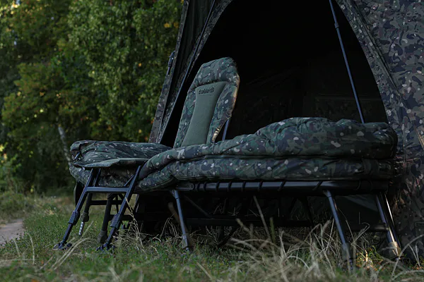 Povrch sedací části je potažen měkkým, hřejivým fleecem, který zajišťuje vysoký komfort při dlouhodobém sezení. Nízký profil křesla zároveň poskytuje stabilní a pohodlnou pozici, ideální například při lovu na krátké nebo přehledné vzdálenosti, kdy oceníte blízkost prutů a možnost okamžité reakce. Přitom si křeslo zachovává velmi malé přepravní rozměry, takže jej pohodlně uložíte pod lehátko nebo na vozík společně s ostatní výbavou.