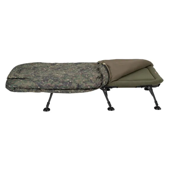 Součástí systému je komfortní třísezónní spací pytel, který je navržen tak, aby poskytoval dostatek tepla po většinu roku. Tlustá výplň a měkký, voděodolný camo povrch zajišťují příjemnou tepelnou izolaci i za chladnějších nocí. Dvoucestné zipy po obou stranách umožňují rychlé otevření či větrání, zatímco držák polštáře zajišťuje, že vše zůstane na svém místě.