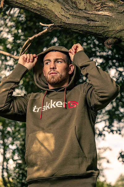 Mikina s kapucí s velkou přední kapsou a velkým vyšívaným logem Trakker na hrudi.