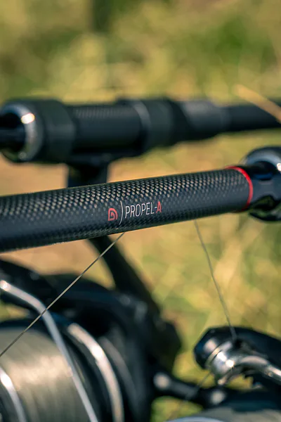 Rukojeť je kompletně potažena japonskou smršťovací fólií, která poskytuje pohodlný, jistý a stabilní úchop i při maximálním zatížení během silového nahazování. Krátké EVA zakončení zvyšuje komfort držení a přispívá k lepší kontrole prutu při zdolávání ryb. Celkový design působí elegantně, čistě a moderně, což činí model Propel-A nejen funkčně, ale i vzhledově výjimečným prvkem kaprařské výbavy.