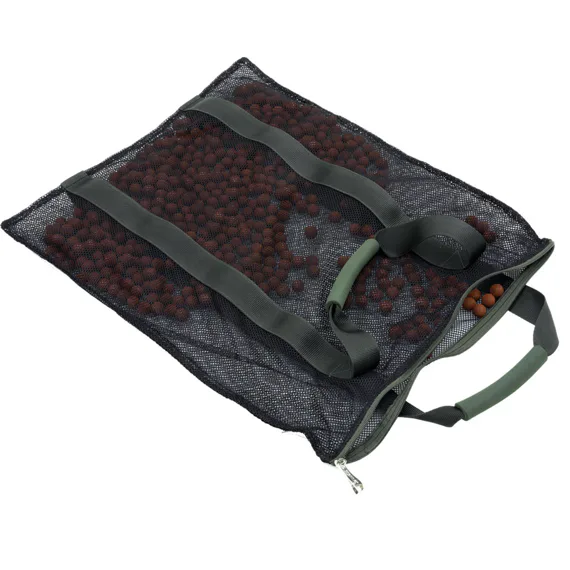Velký sak na boilies se zapínáním na zip, vyrobený z prodyšné síťoviny.