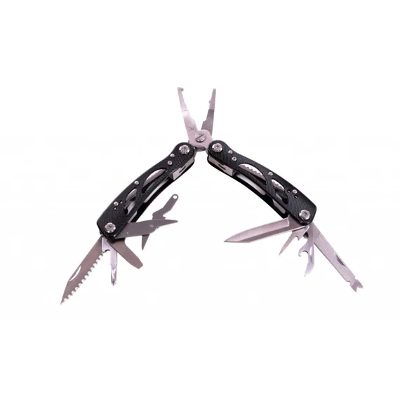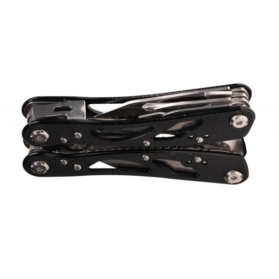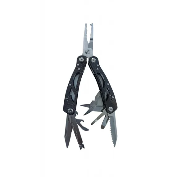 V kompaktním těle najdete nejen klasické kleště s hrotem na rozevírání kroužků a krimpovací částí, ale i praktické doplňkové nástroje – jako je nůž, pilka, šroubováky nebo otvíráky.
